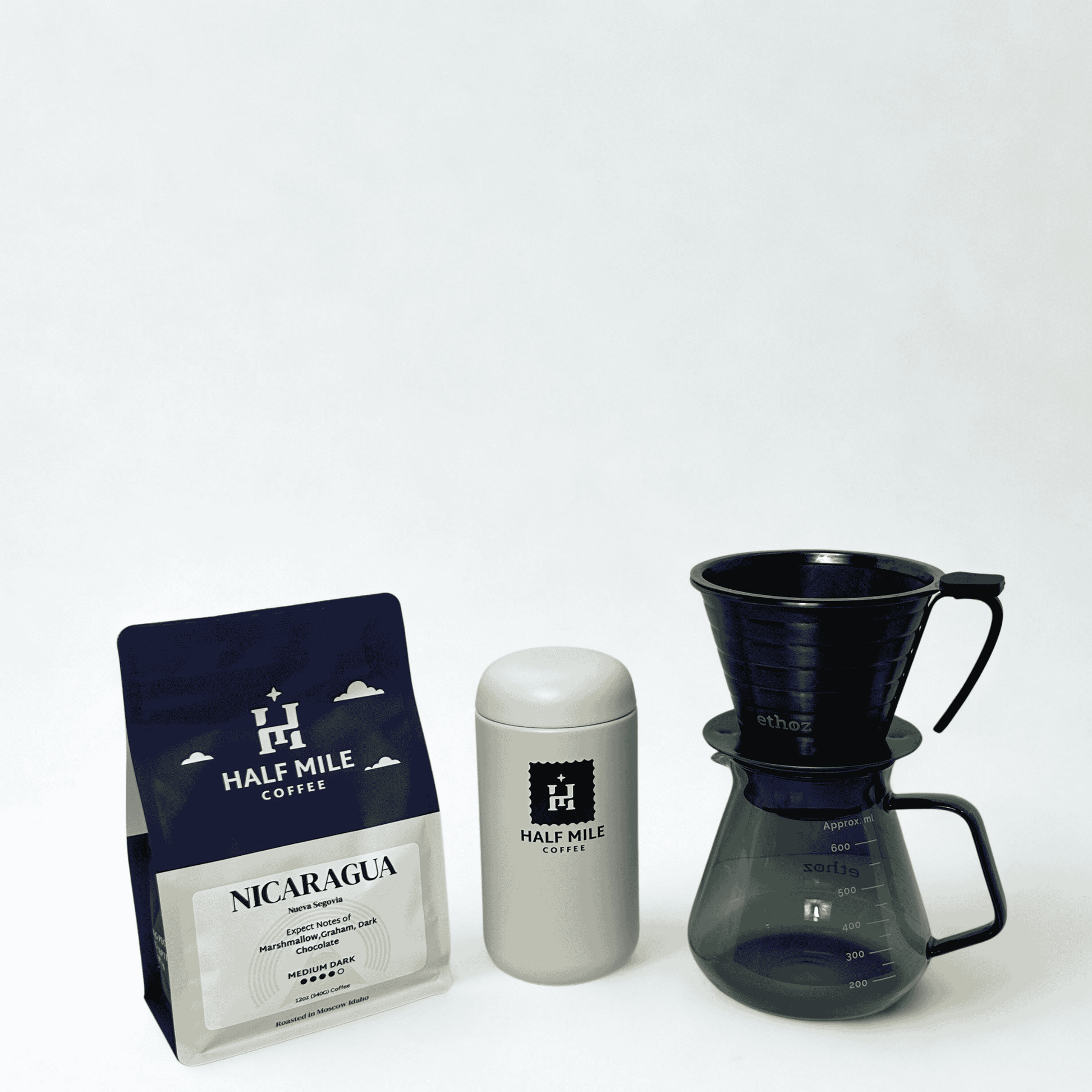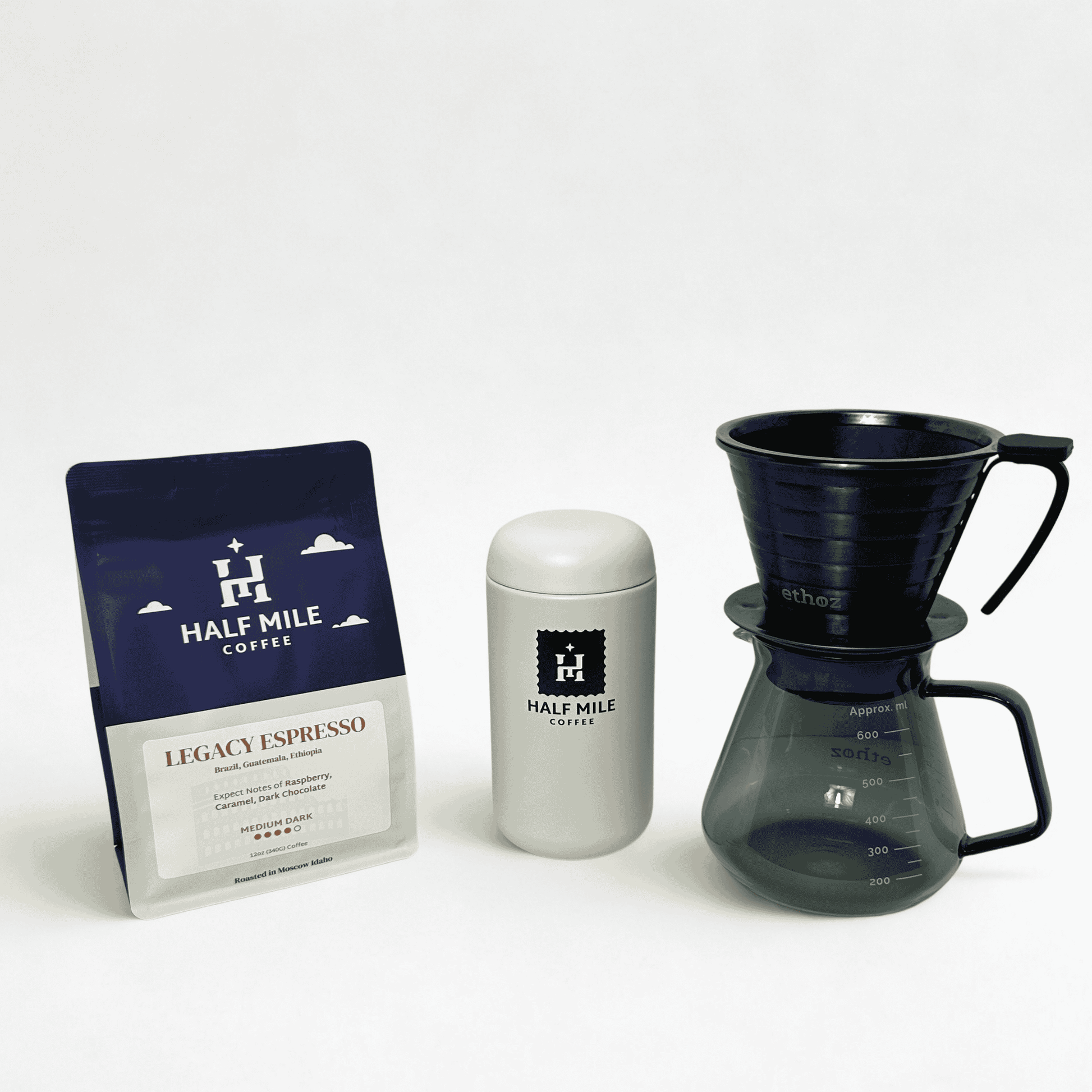 Bring the full café experience home. The Complete Experience Bundle combines every element of the Half Mile ritual—freshly roasted specialty coffee, a precision Ethoz brewer, elegant Ethoz serving pitcher, and our signature Capsule Cup.
